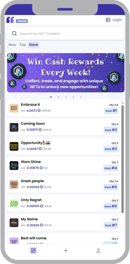 Earn weekly rewards by holding shares in top-ranked NFTs! On Phrase Trade, NFT rankings are based on total trading volume, with the highest-ranked NFTs sharing half of the weekly rewards collected in the Reward Pool. Invest in high-ranking NFTs and enjoy regular rewards simply by holding shares in these top assets.
